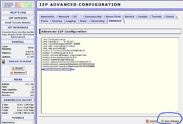 これで他のマシンのウェブブラウザから、http://192.168.0.10:7657/index.jsp にアクセスできるようになりました。でも、これでは誰でもアクセスできてしまうのでパスワードを設定しましょう。